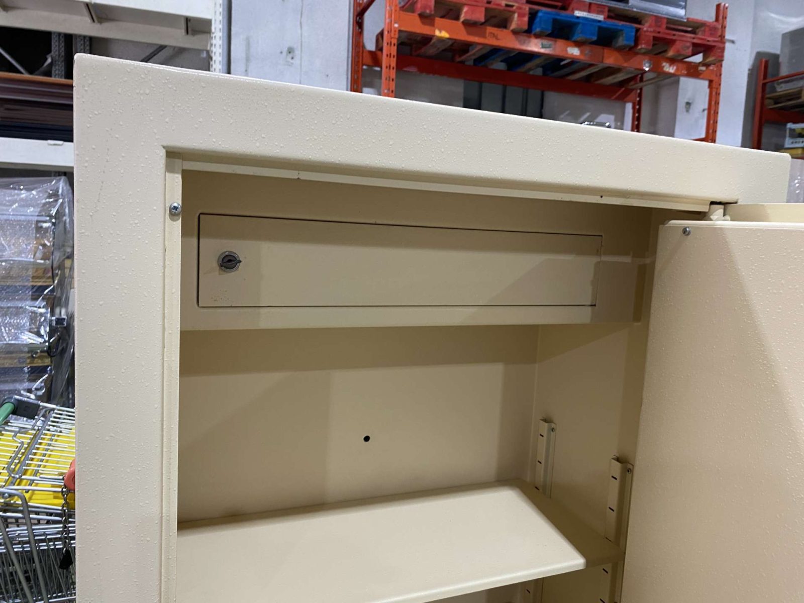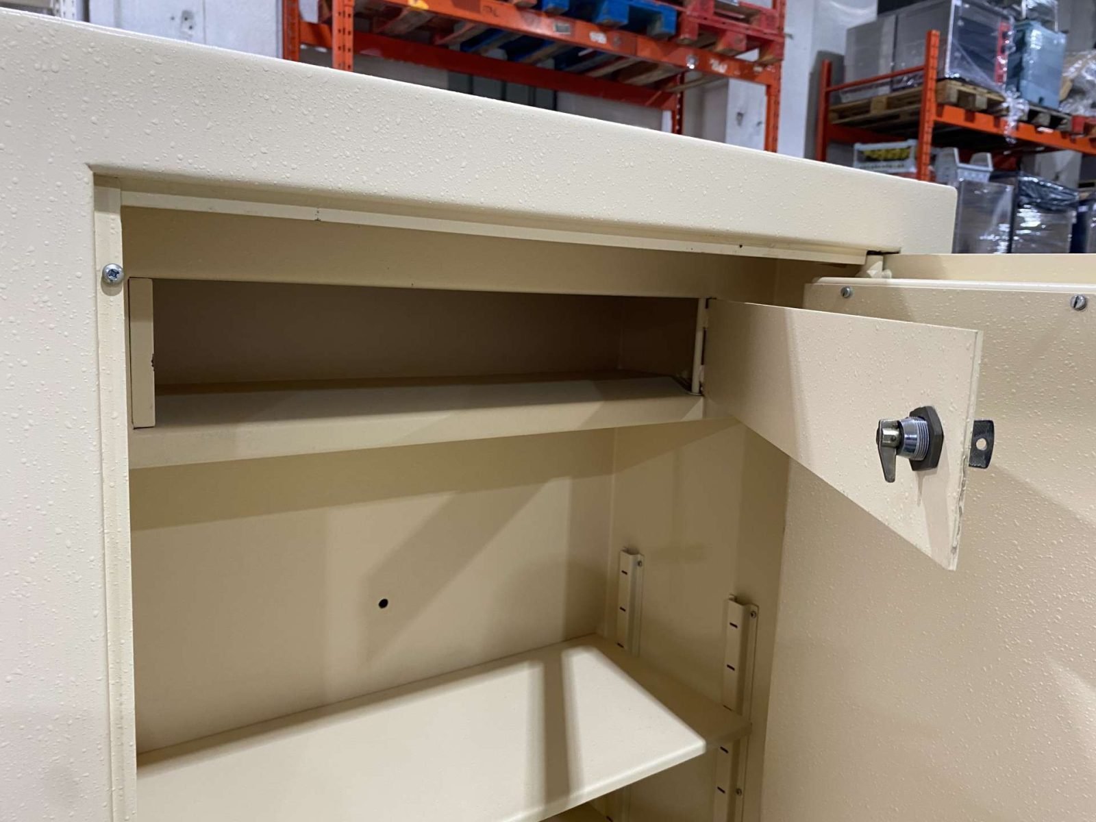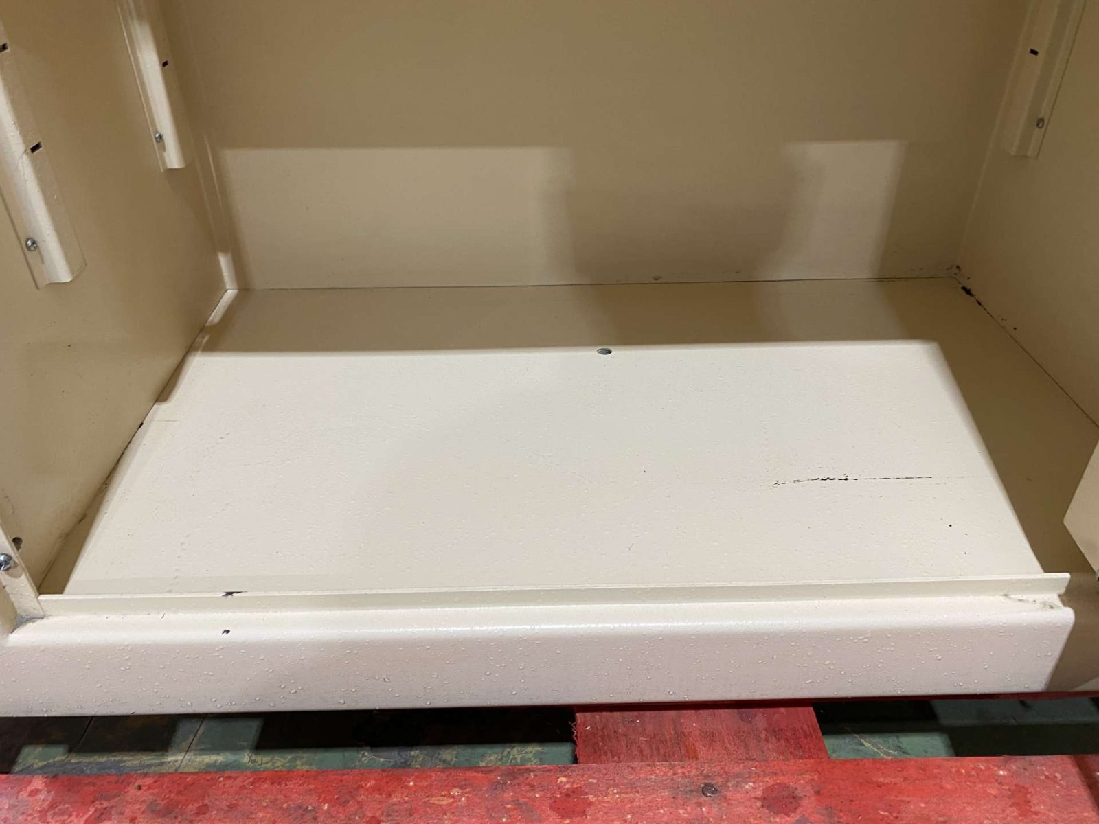 Biztonsági irat és értéktároló szekrény. Tűzálló, megfelel a német VDMA 26992 sz. szabványnak. 6 pontos biztonsági ajtóval és felső zárható rekesszel szerelt.