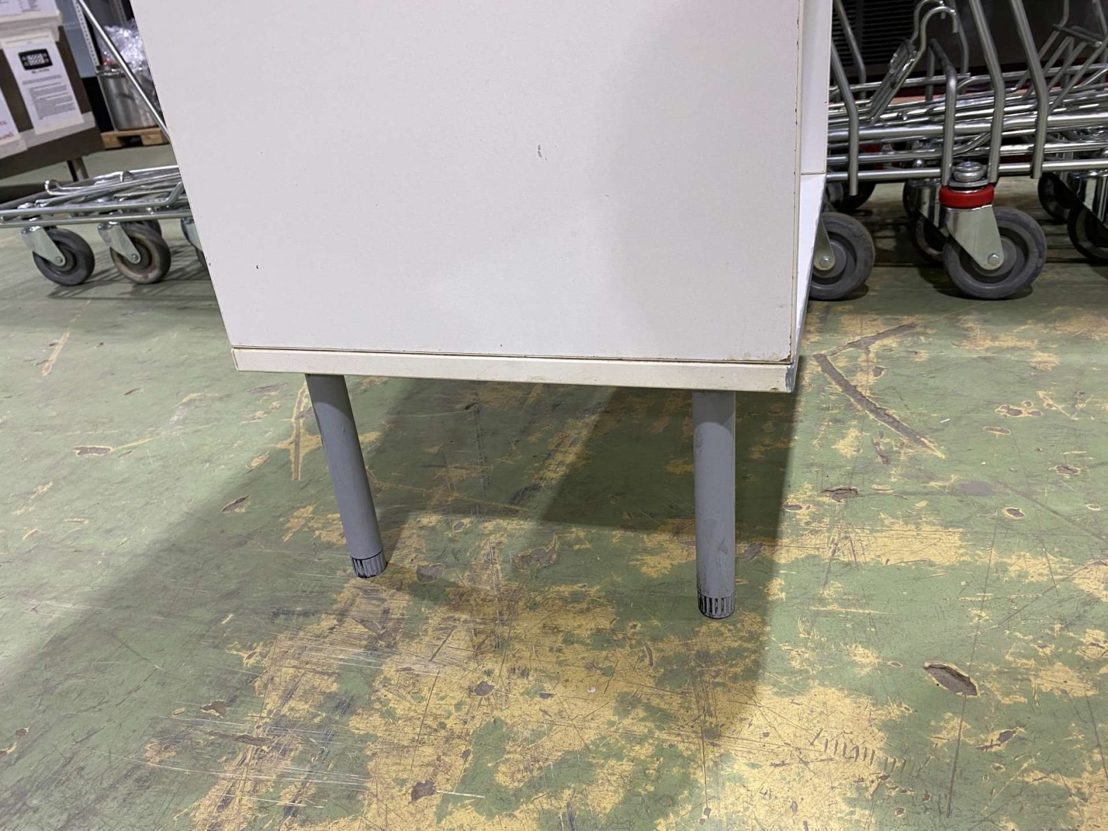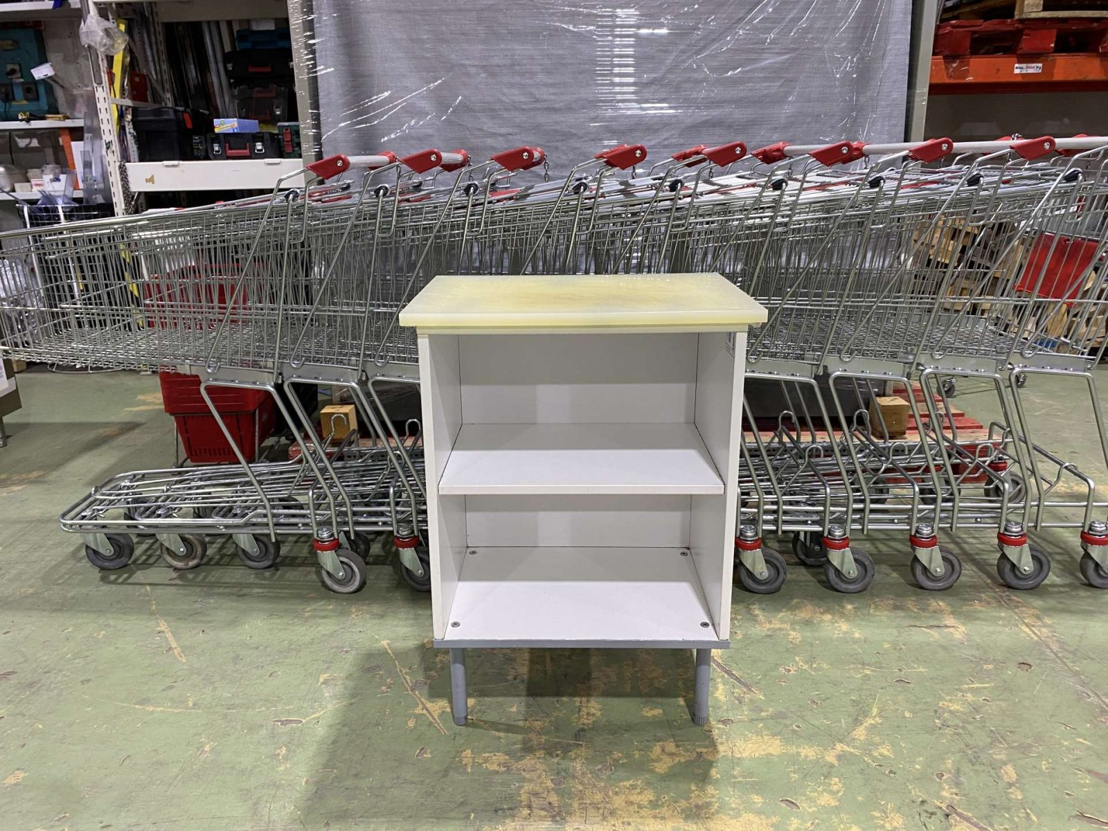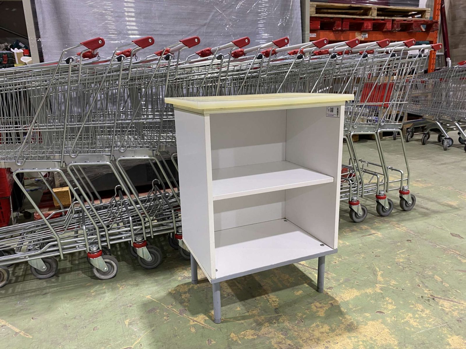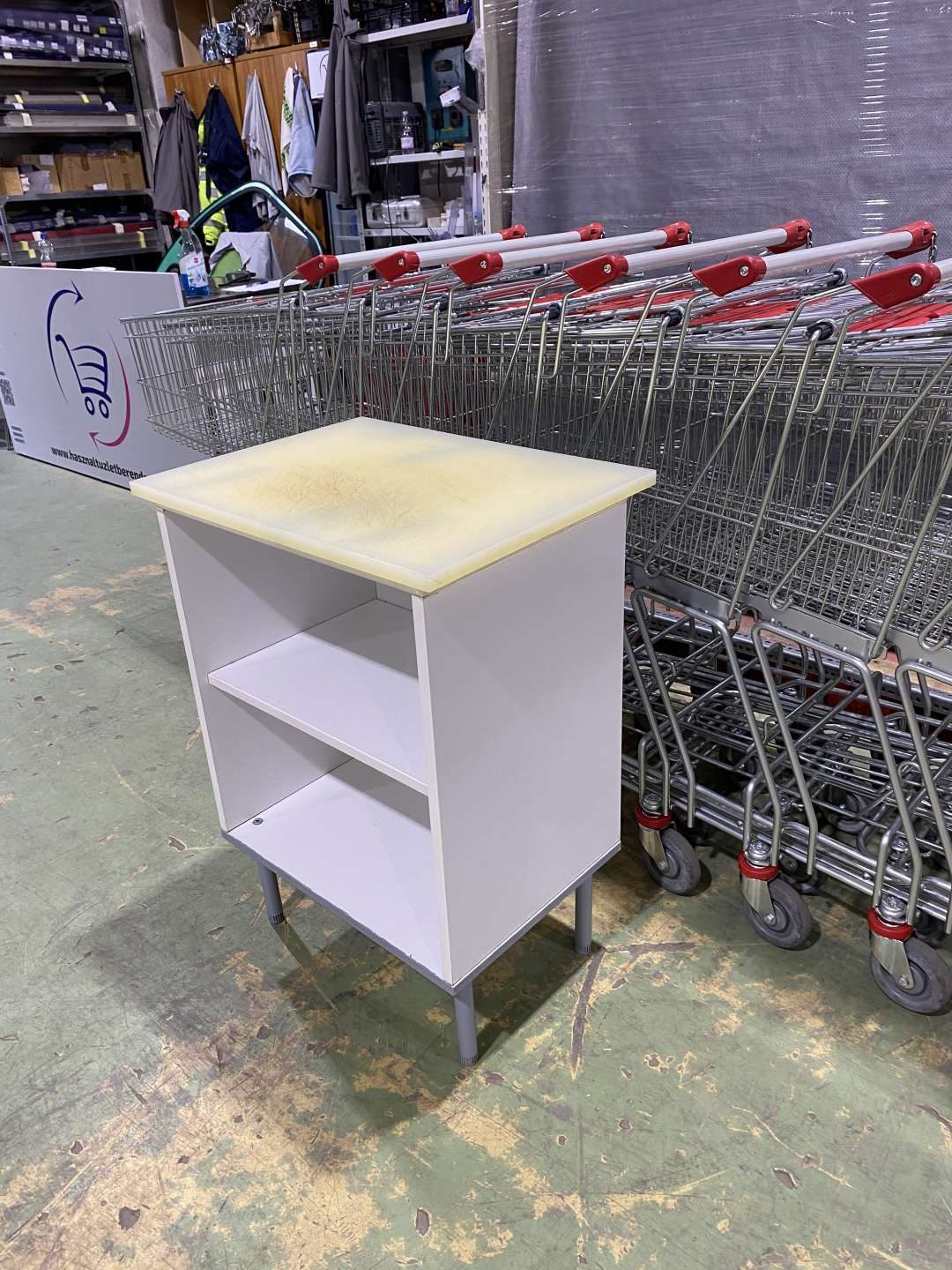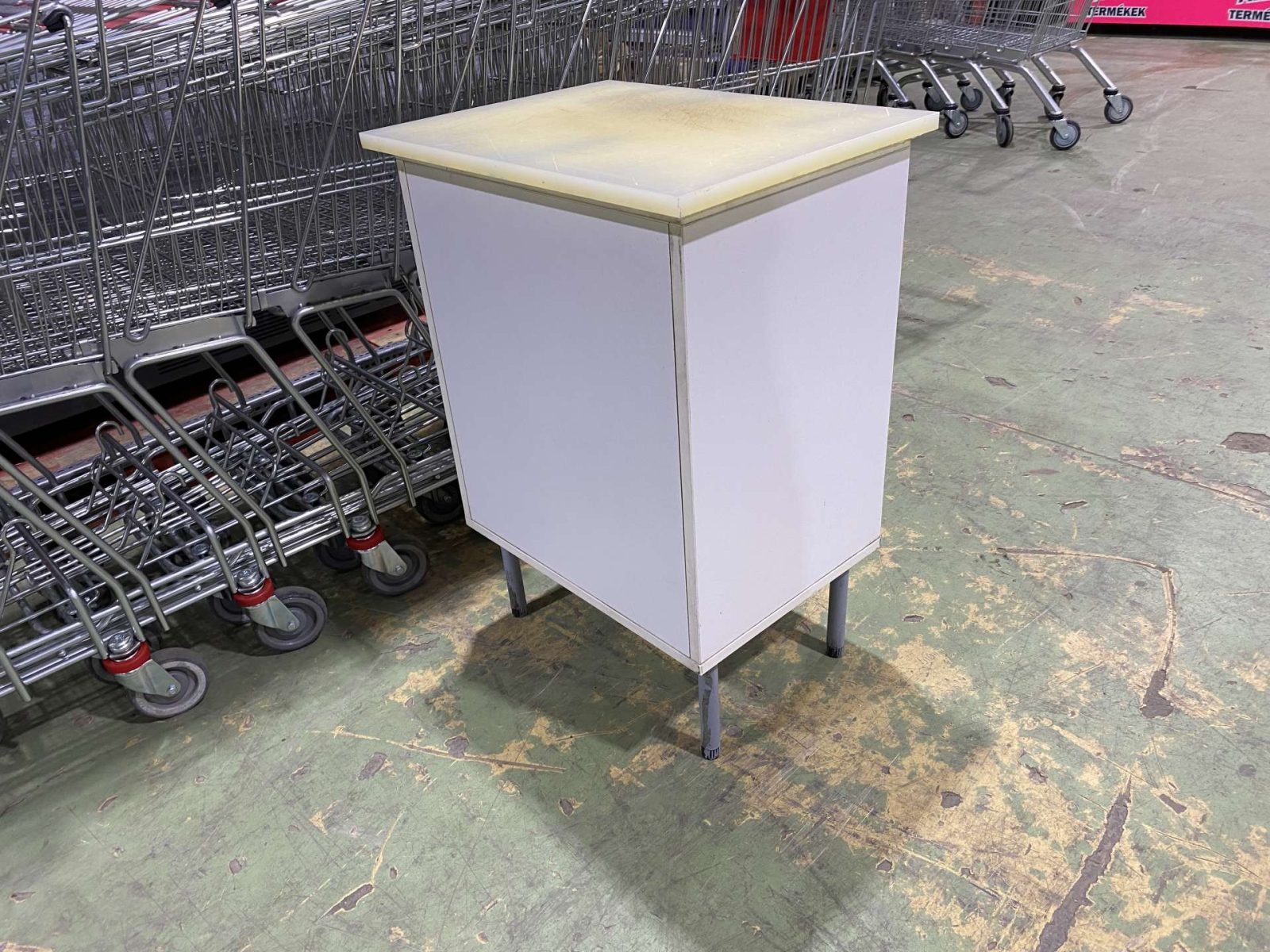 Hentes,- vagy élelmiszerüzletbe ebonitlapos munkaasztal, lábazati szekrény, köztes polccal. 60*45*84 cm. ( Szélesség*mélység*magasság)