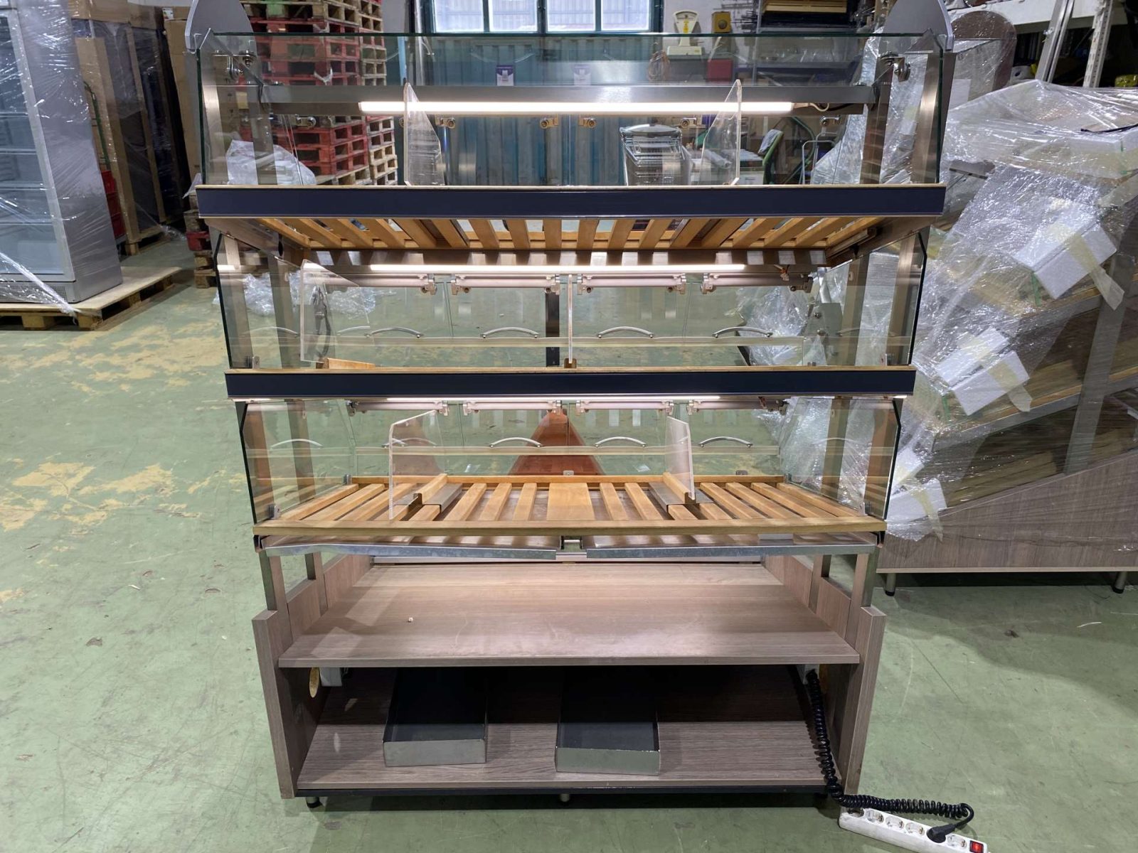 Német import fimompékáru adagoló, kínáló. Masszív rozsdamentes vázon üveglapos zárás felnyitható leheletvédővel. Igényes, higiénikus pákárubemutatás. 10 cm-es lábakra szerelt, így könnyen mozgatható, szállítható. Szintenkénti beépített világítással.