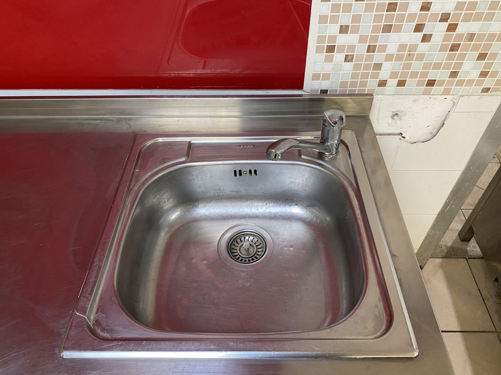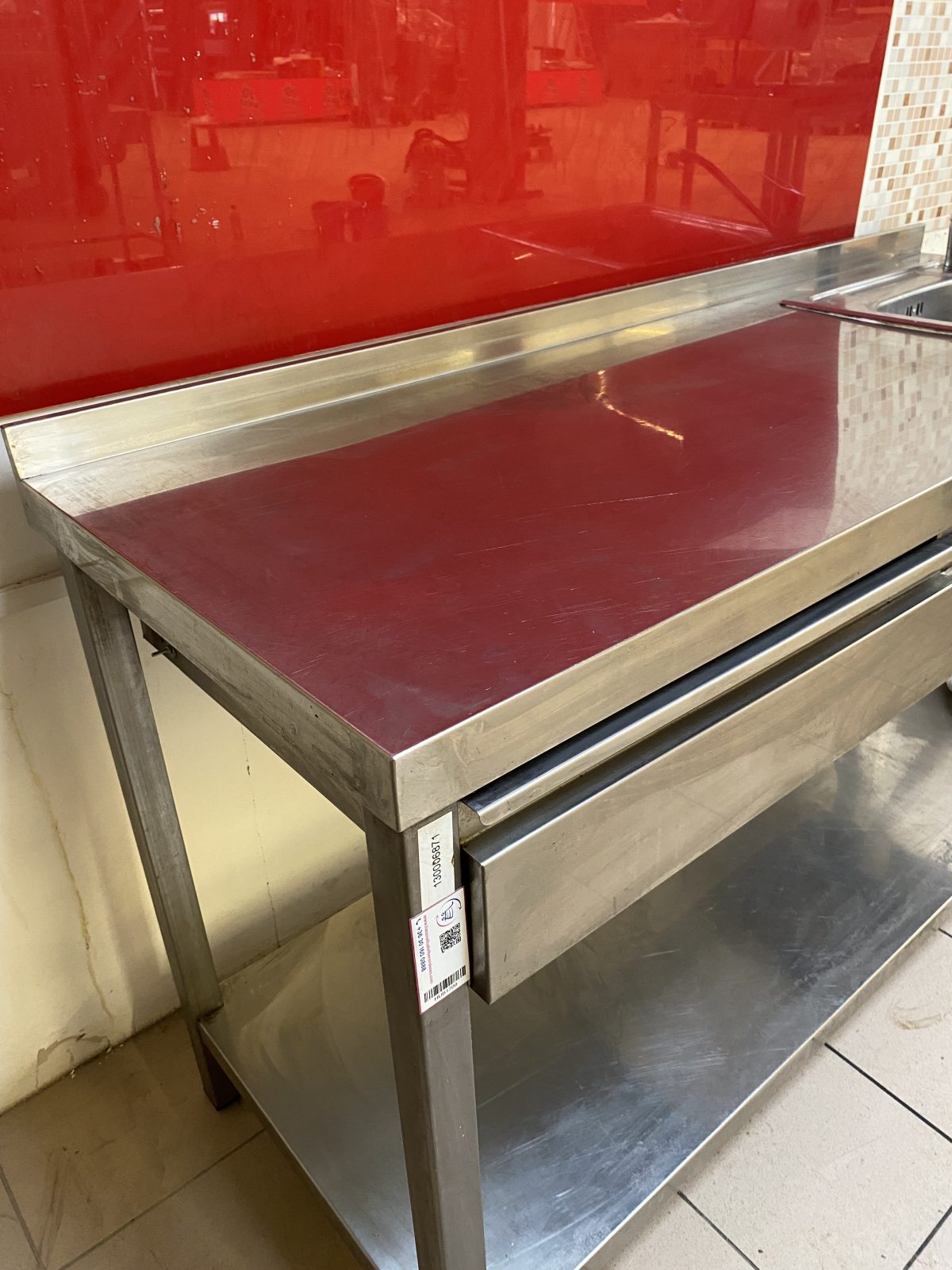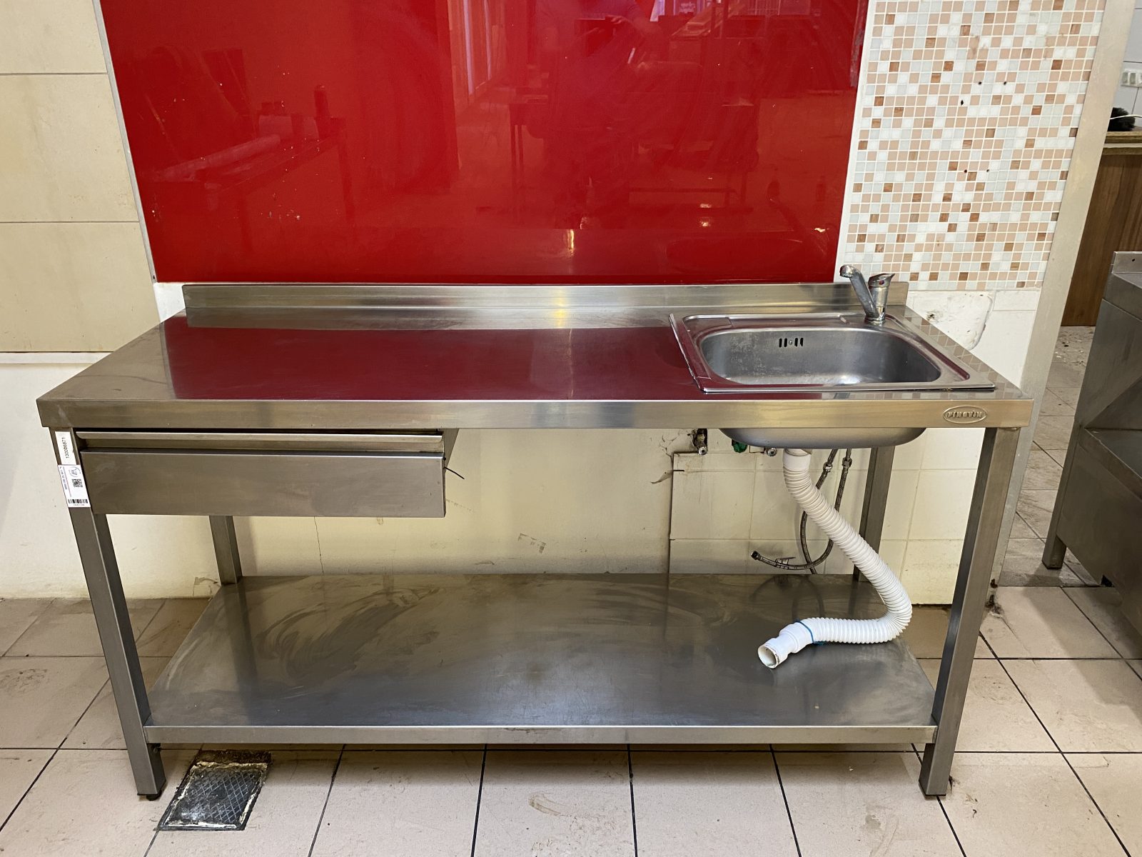Rozsdamentes munkaasztal 160*60*85cm. ( Szélesség*mélység*magasság) Hátsó felhajtással, alsó polccal, beépített kézmosóval, mosogatóval és fiókkal.