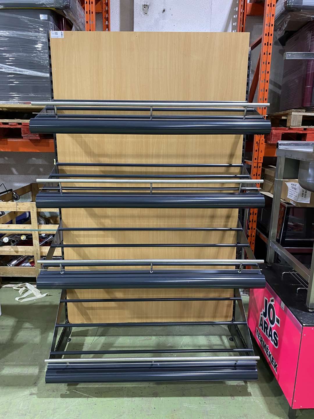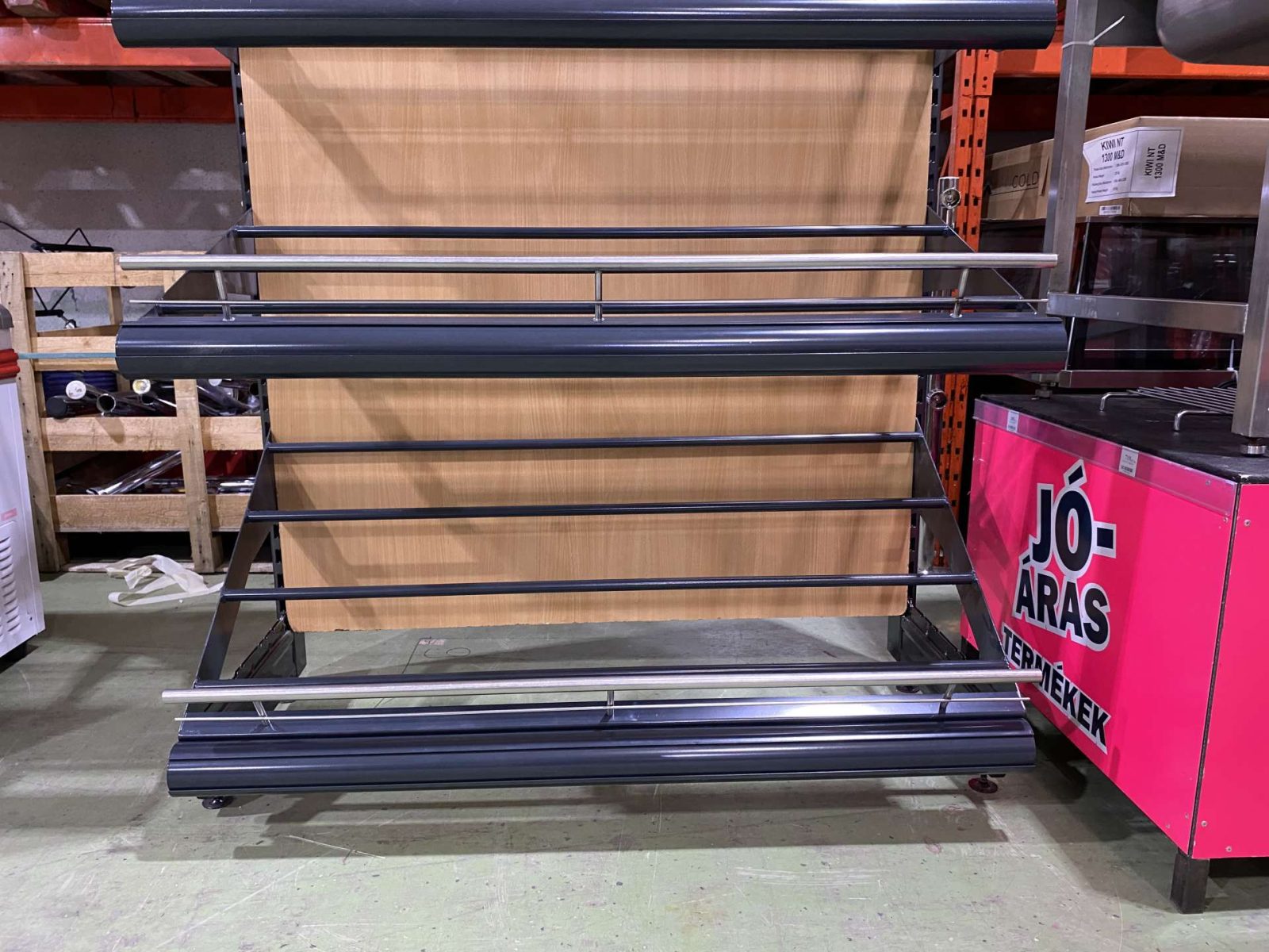 Fekete oszlop és láb, antracit polcok. Utóbbiak újonnan színterezve! Polcokon rozsdamentes kidőlésgátlók.
