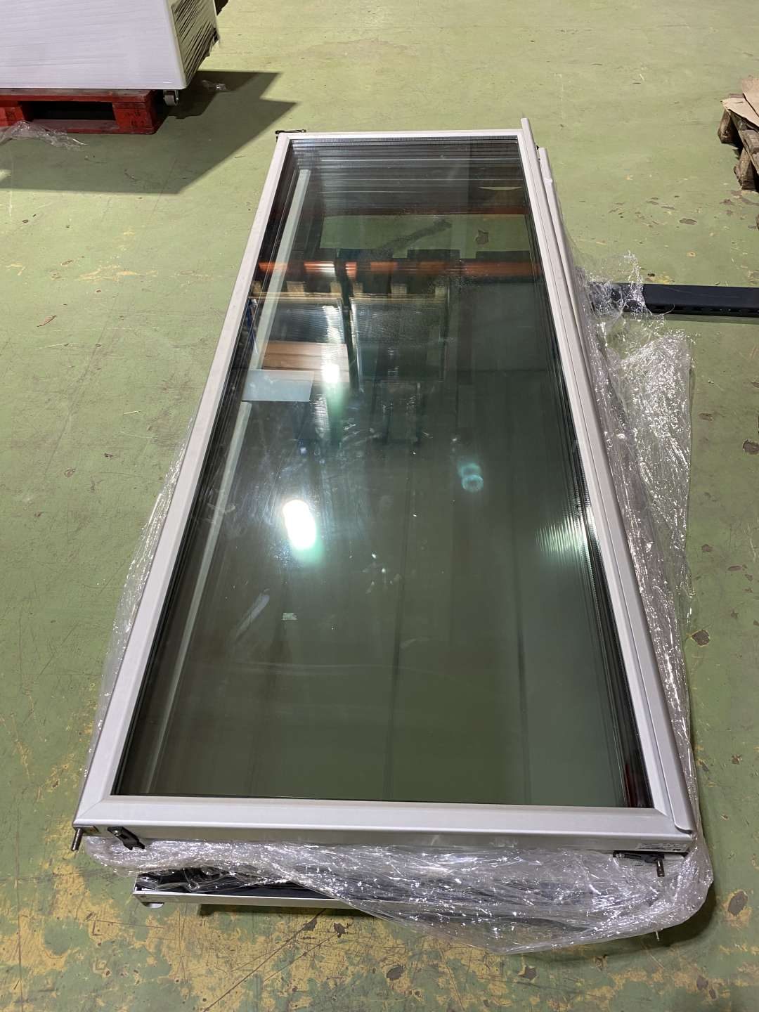 5 ajtós szendvicspanelbe, vagy falba építhető alumínium keret CISAPLAST alumíniumtokos thermoajtóval. Dupla üvegezés, masszív, újszerű állapot. Beépíthető kereten vertikális világítás fénycsövek részére.