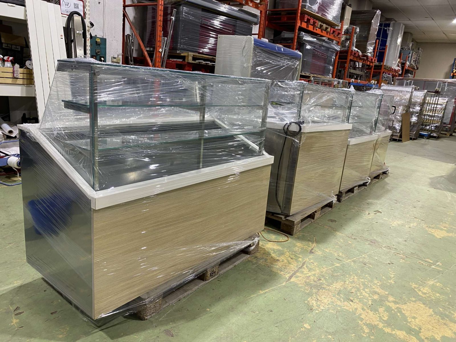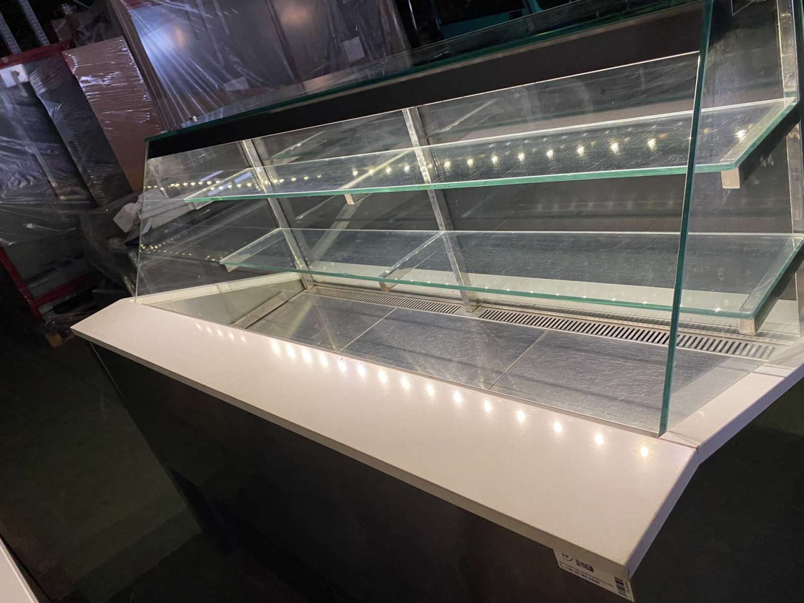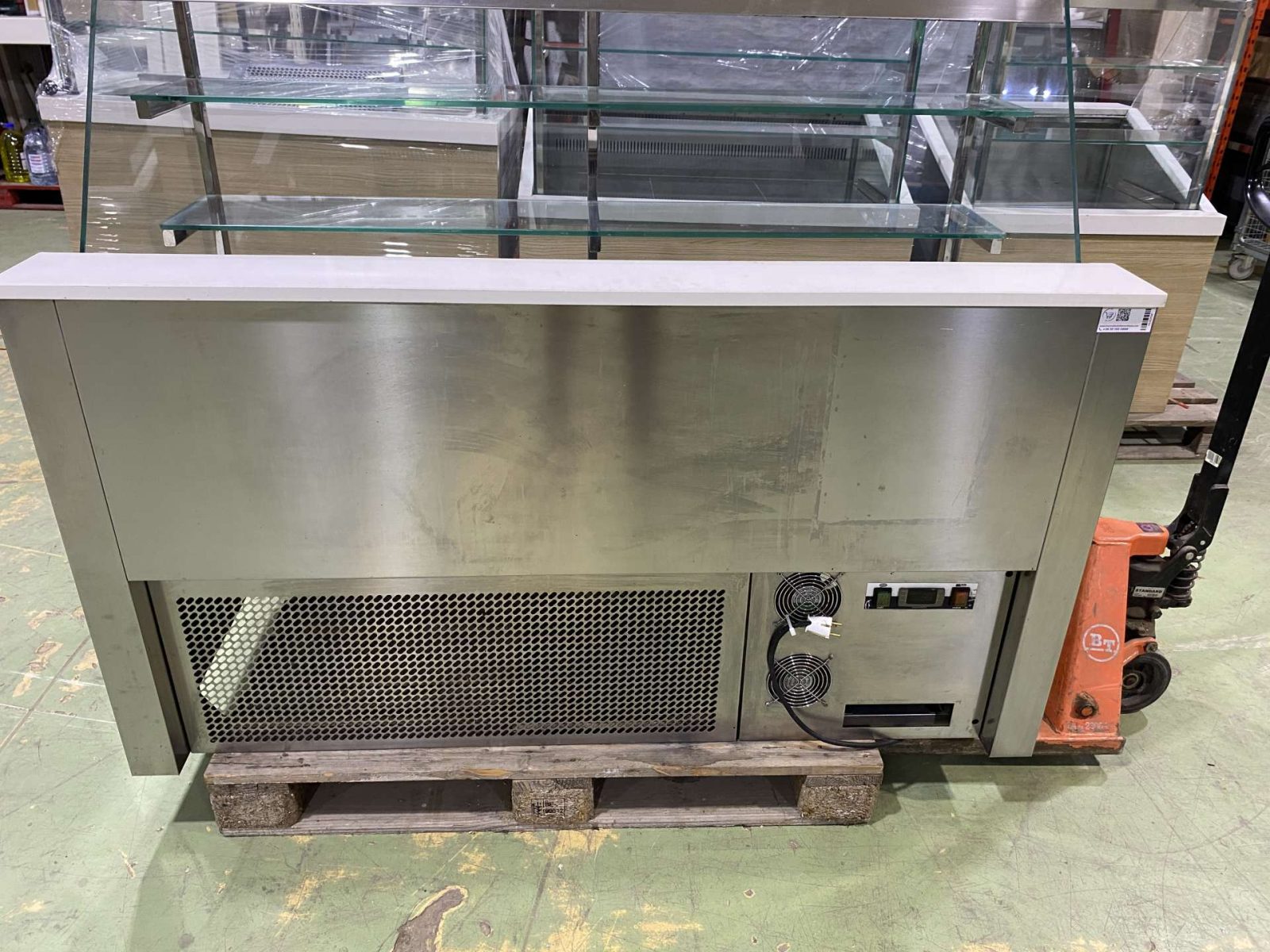 (Cikkszám 2698) Hűtött vitrin alsó medencével és kettő darab üvegpolccal, valamint háromoldali leheletvédővel, beépített hűtéssel. Bútor mérete: 160*80*127cm. (Szélesség*mélység*magasság)