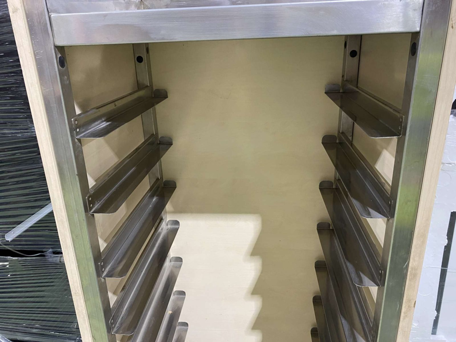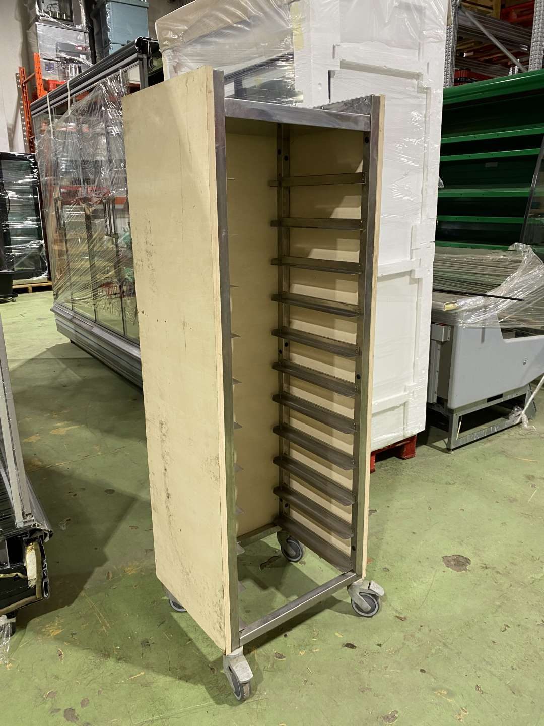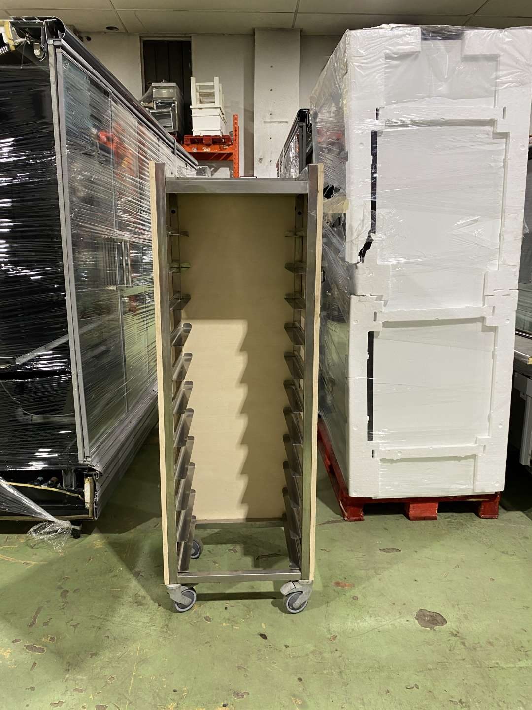 Rozsdamentes tálcaleszedő kocsi, 4 darab bolygókerékkel, háromoldali burkolattal. 11 darab tálca fogadására kialakítva, 45*40 cm-es tálcamérethez.
