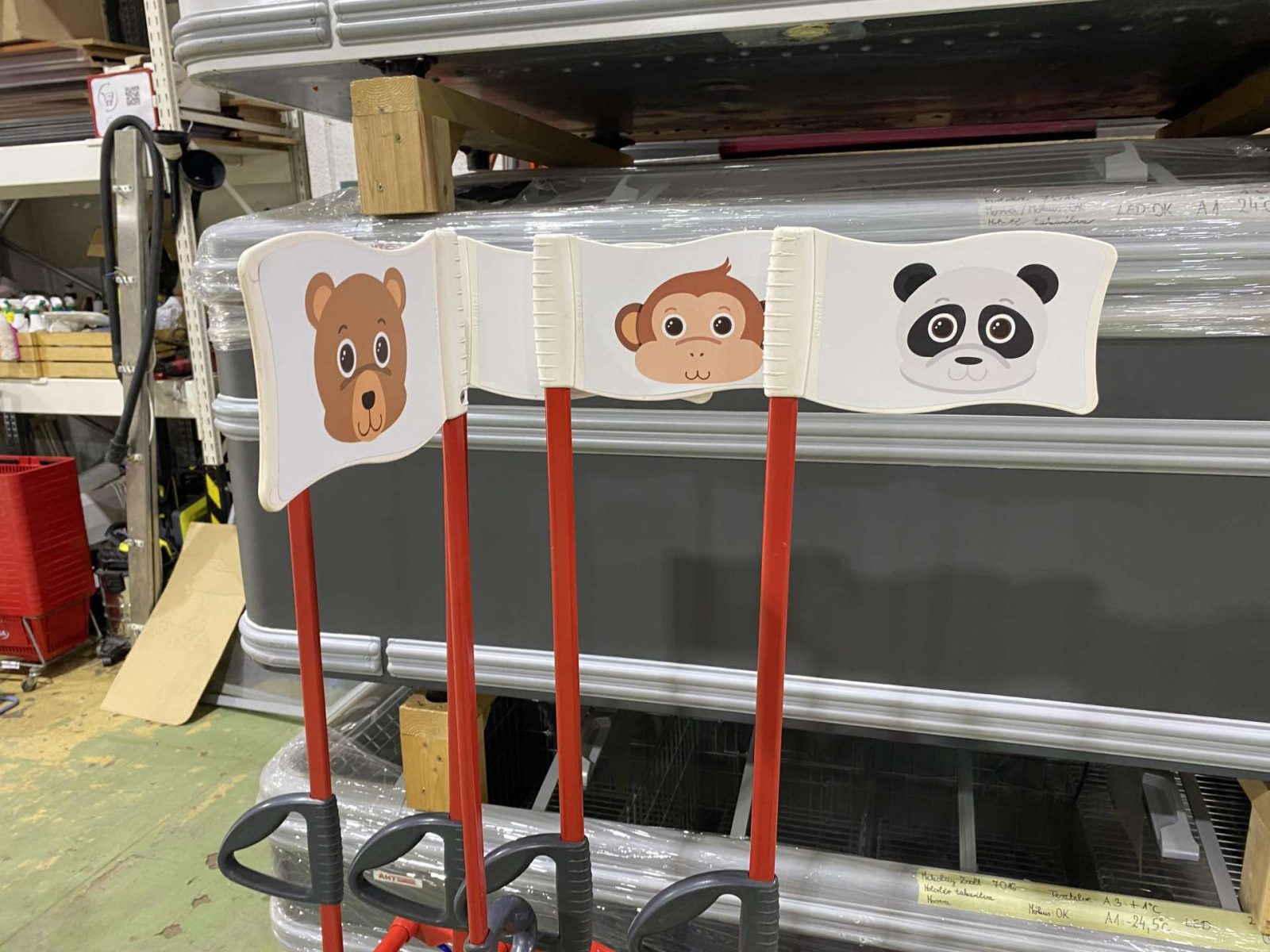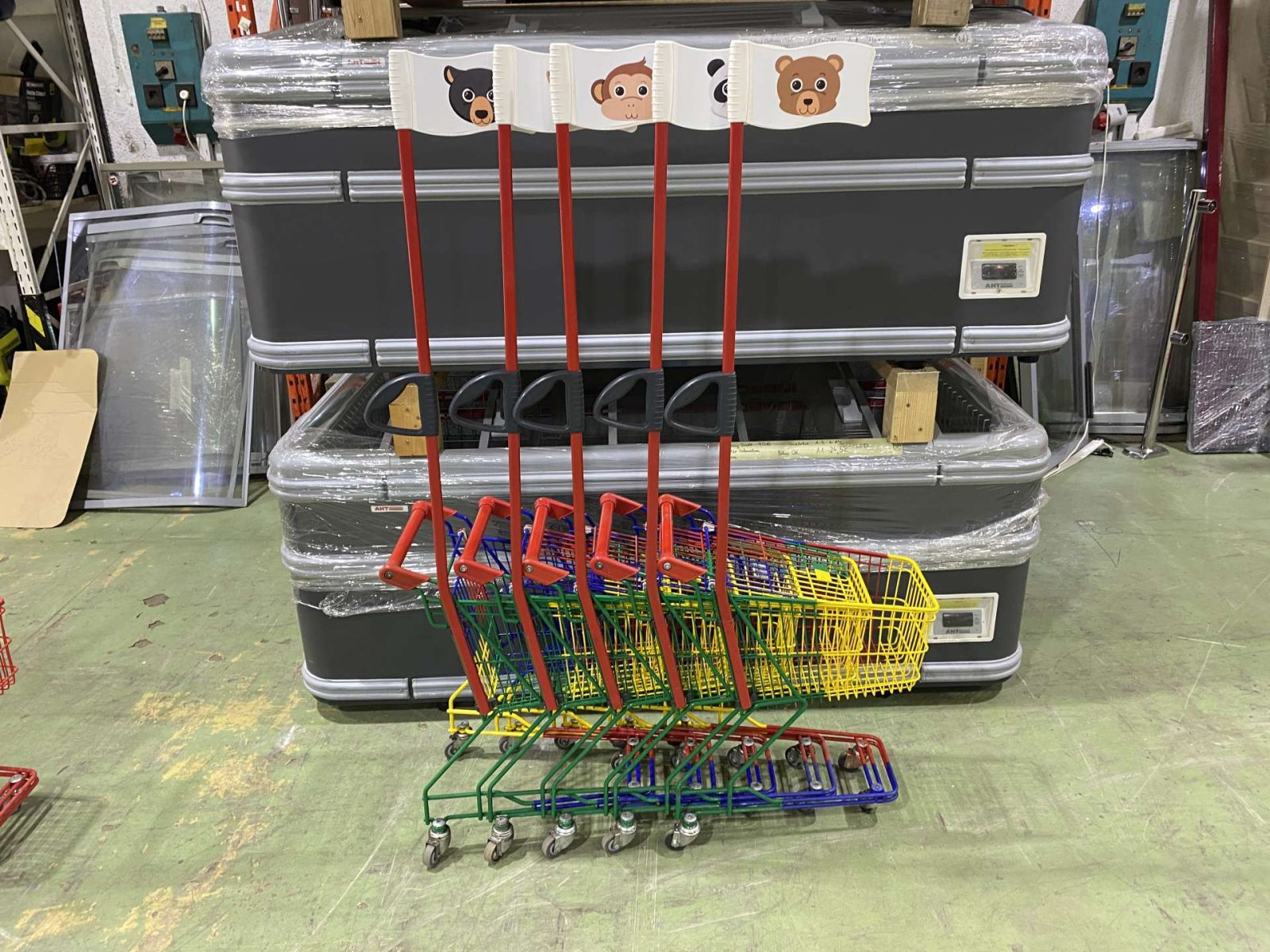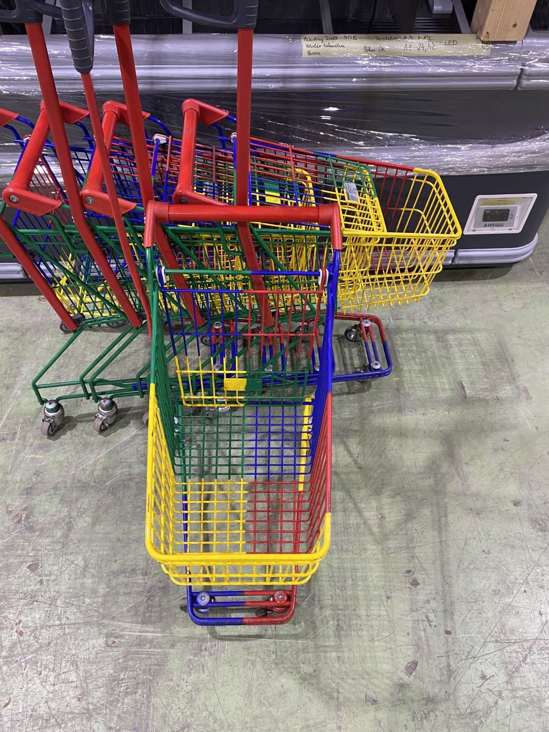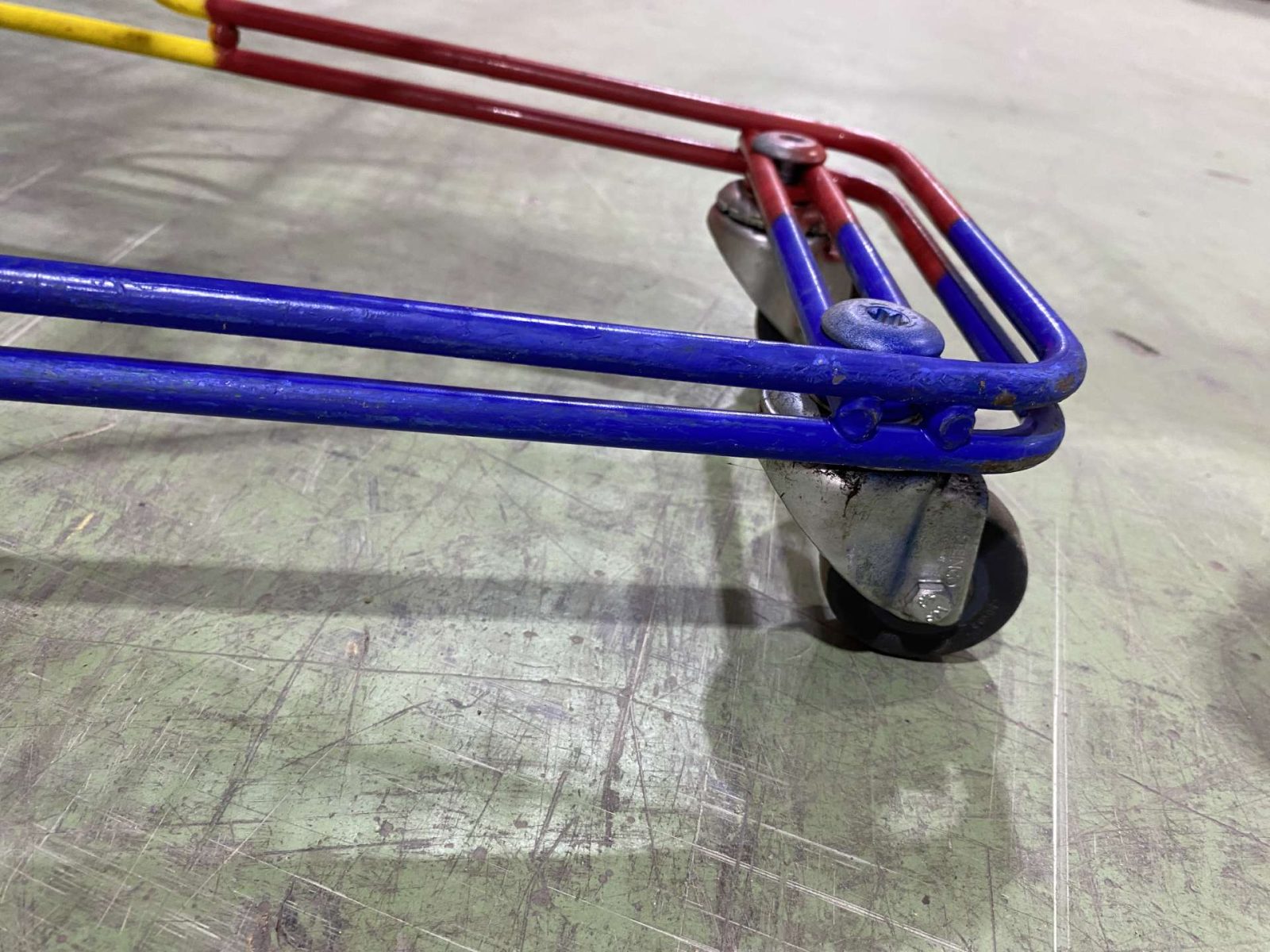 Szürke csőmarkolattal és piros műanyagokkal szerelt színterezett ("Harlequin") gyerek bevásárlókocsi.
