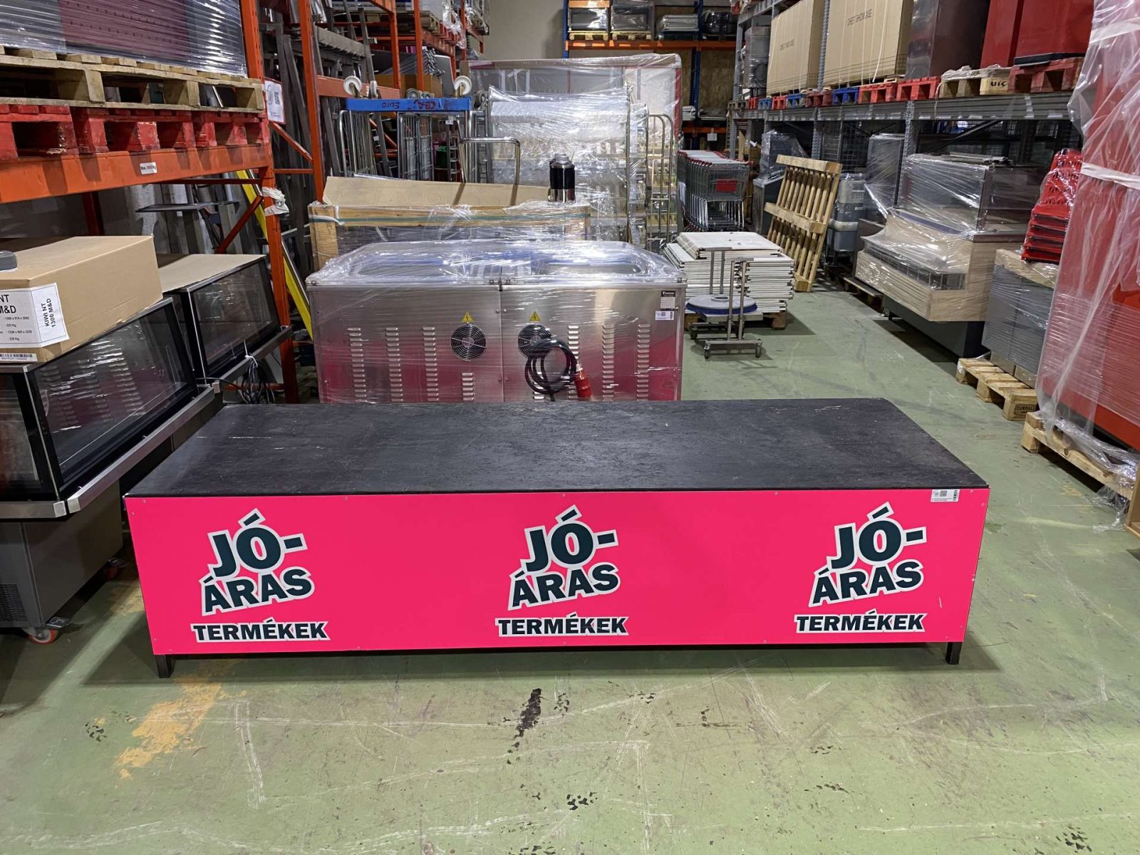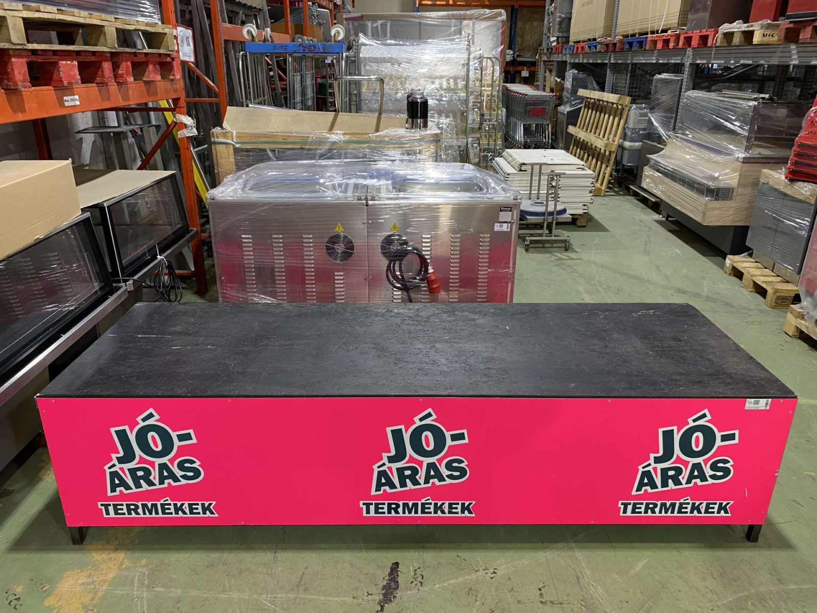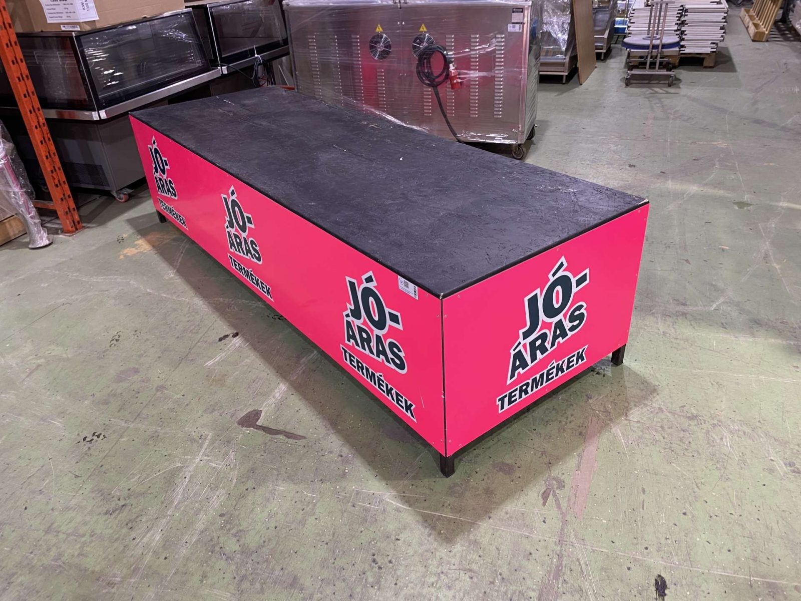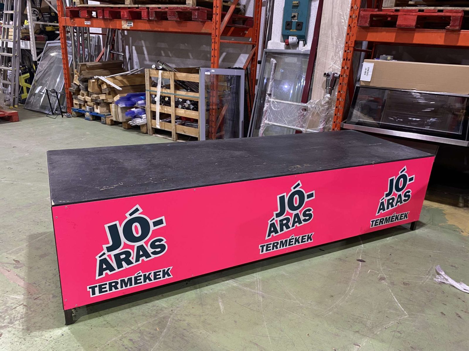 Egyedi gyártású promóciós kihelyezés. 240*80*60 cm. Rendkívűl masszív, 3*3-as zártszelvény váz és merevítők.
