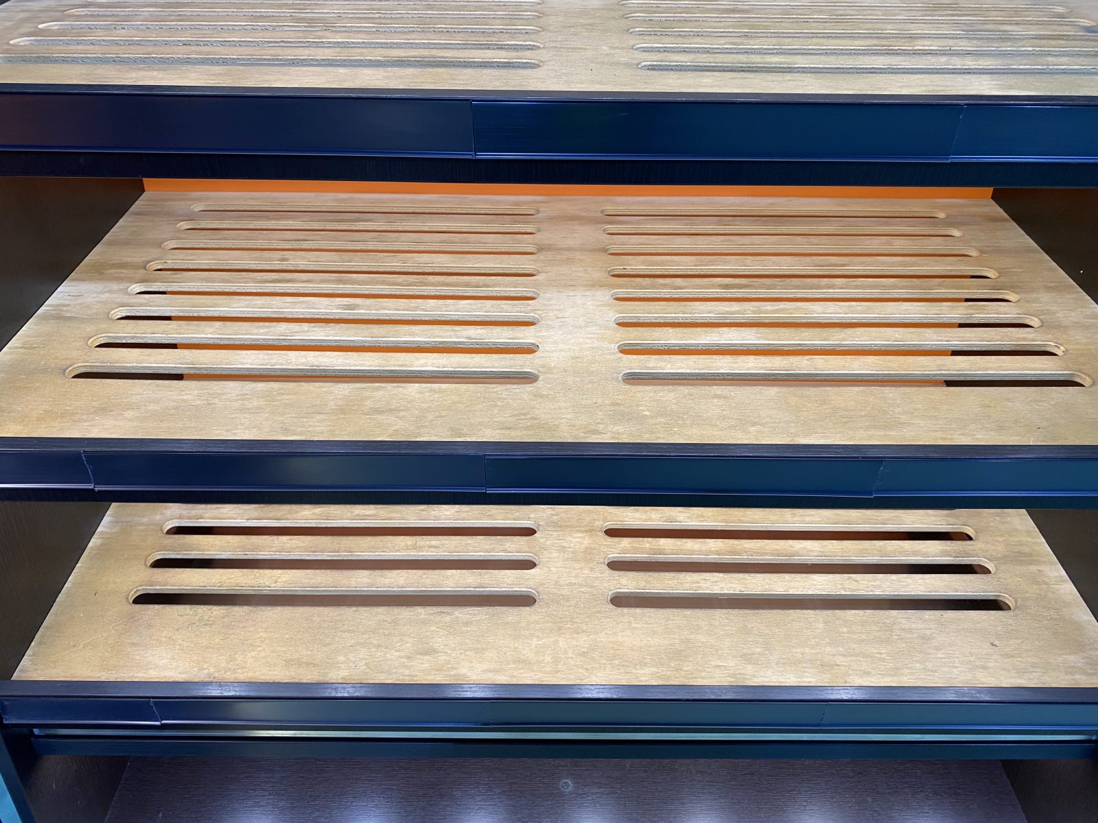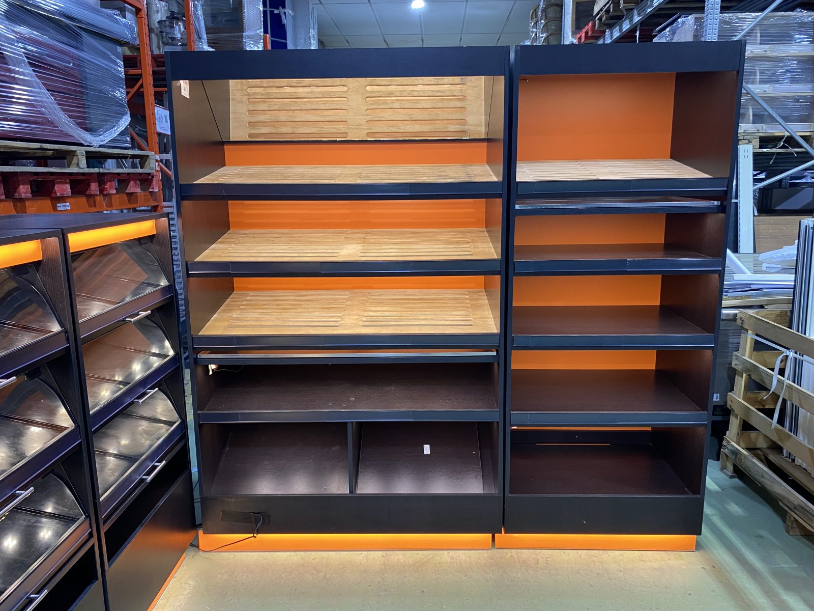 Újszerű kenyeres állvány 5 sor polccal. 3 sor farács polc és 2 sor bútorlap polc. Polconként beépített LED világítás, új polcsínek. Döntött tükrös fríz és lábtakaró. Több darab vásárlása esetén ajándék mennyezeti záróelem, beépített LED világítással.
