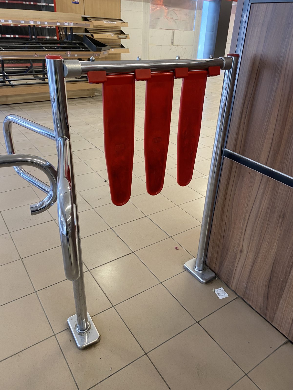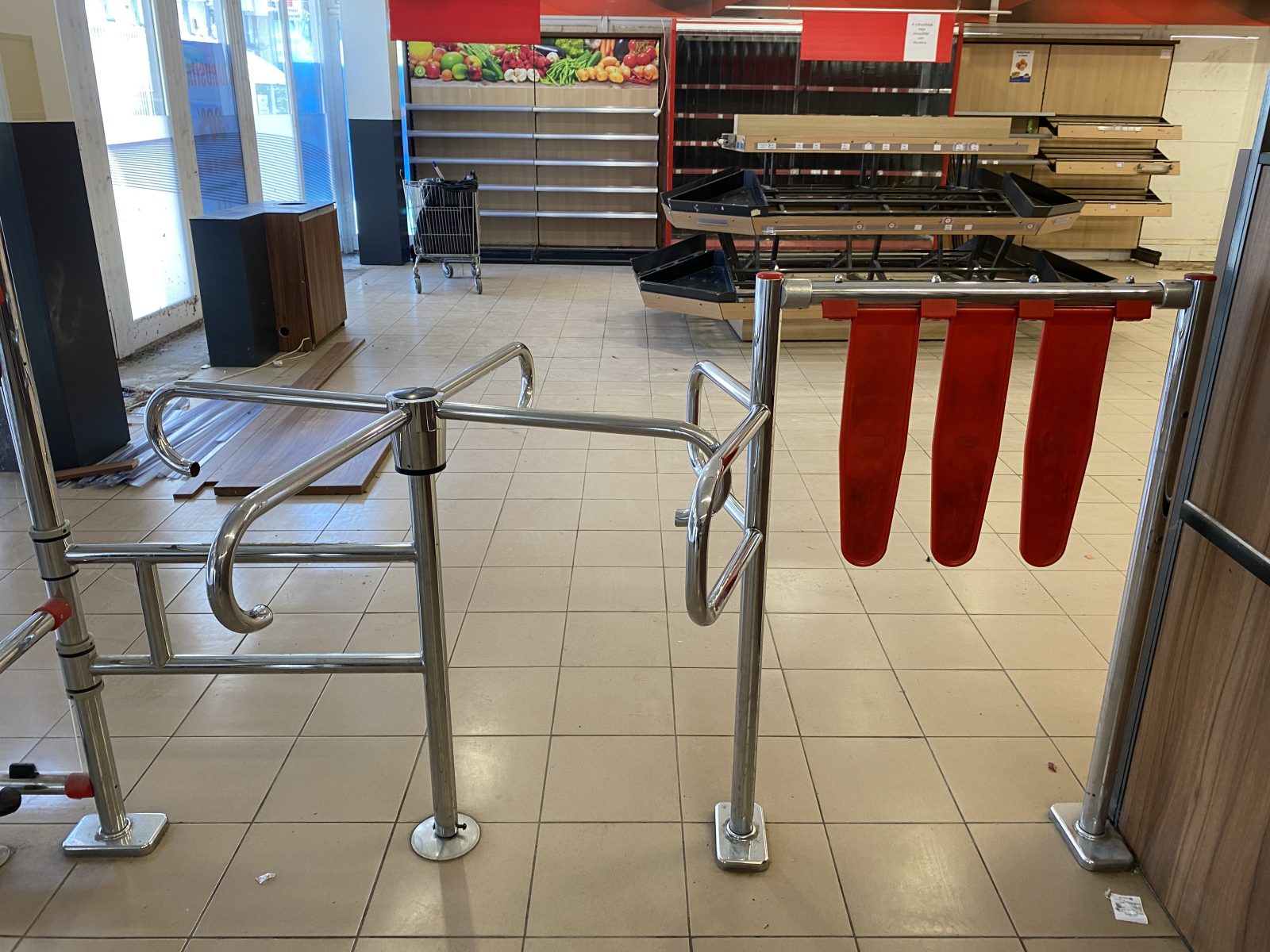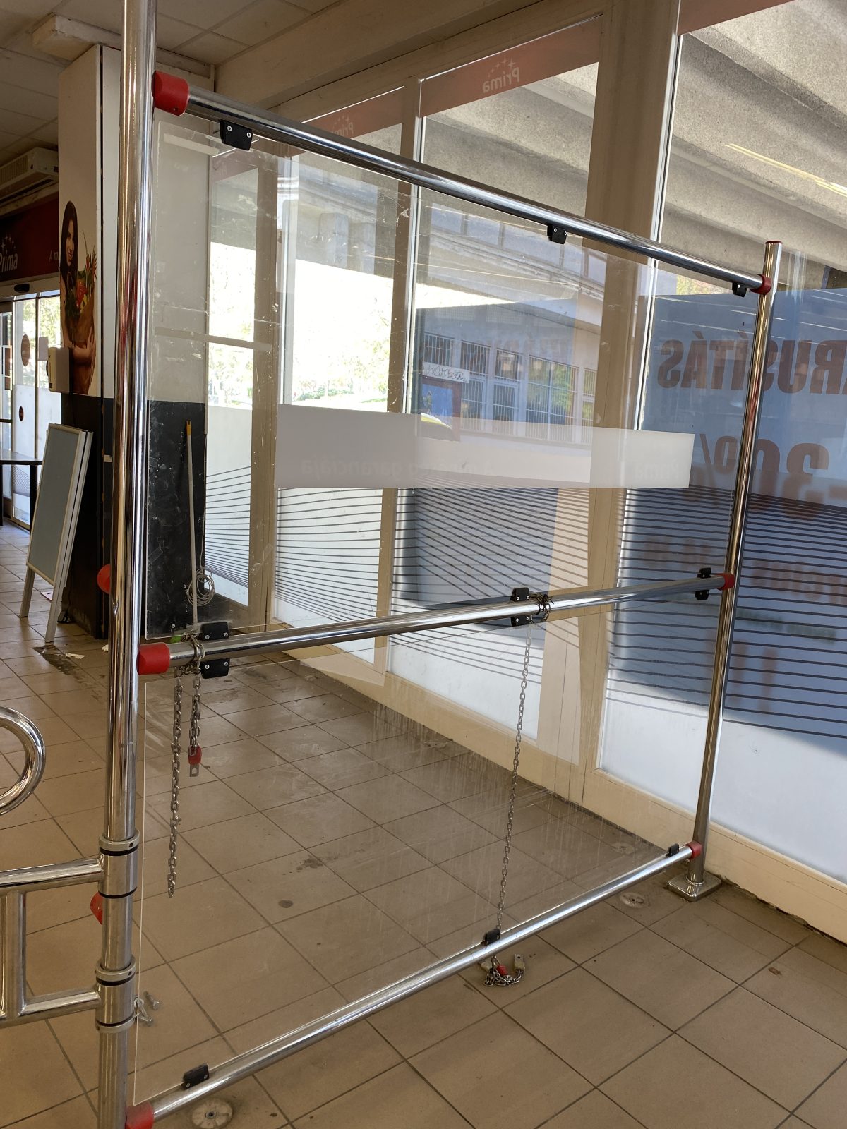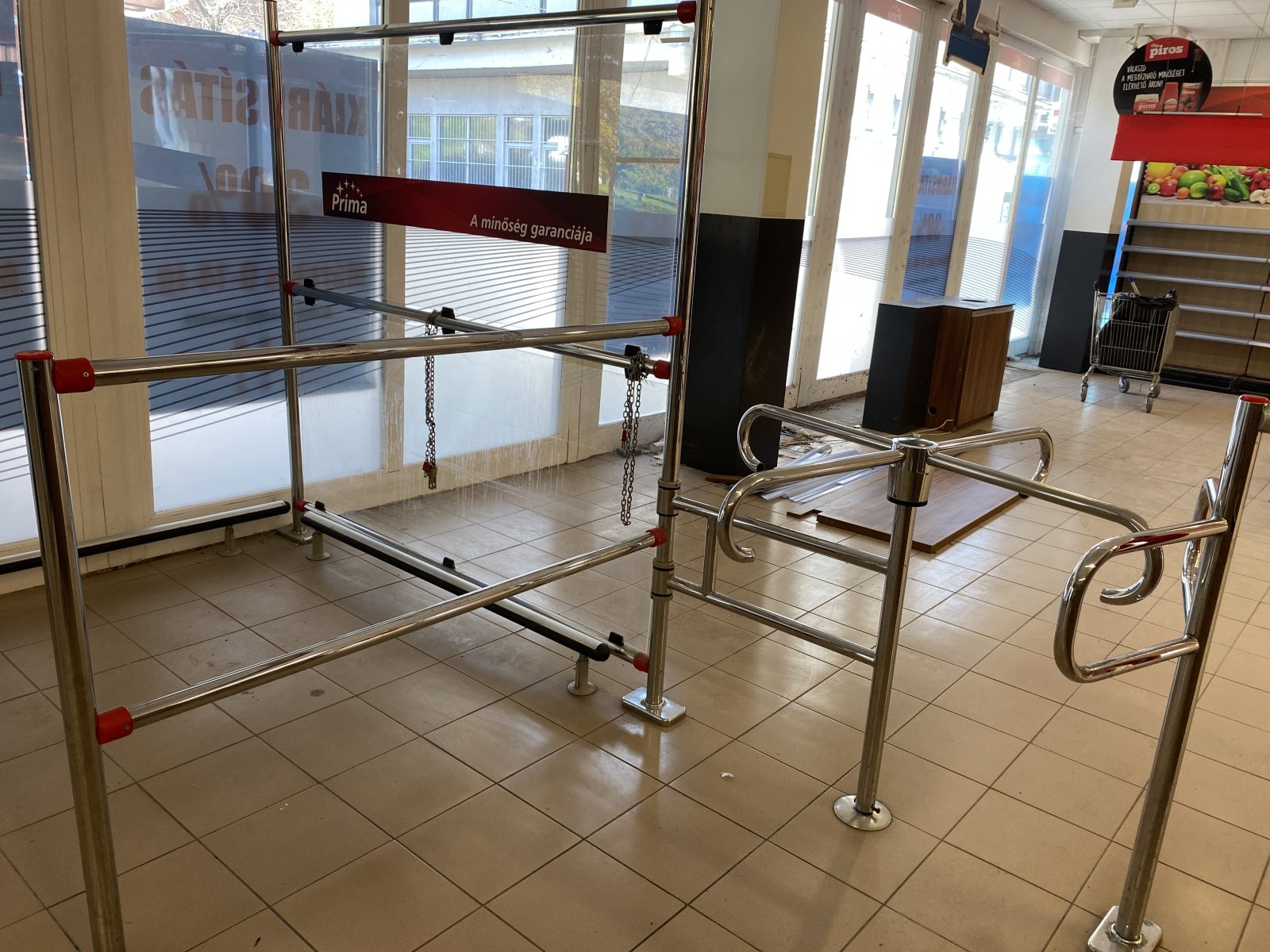 Teljes rendszer, plexifal, terelőkorlát, forgókereszt és kocsibeengedő. + ~ 130 cm kétsoros dupla soros korlát és kocsiindító láncok. Plexilapokon apró karcolások vannak.